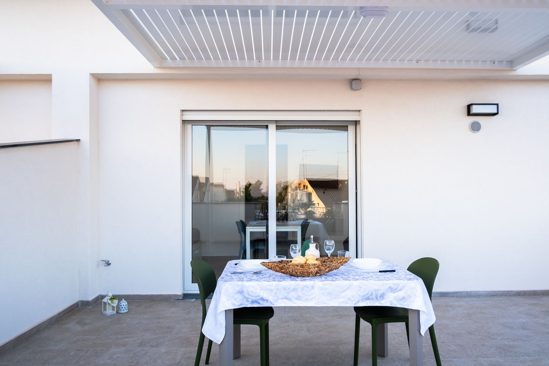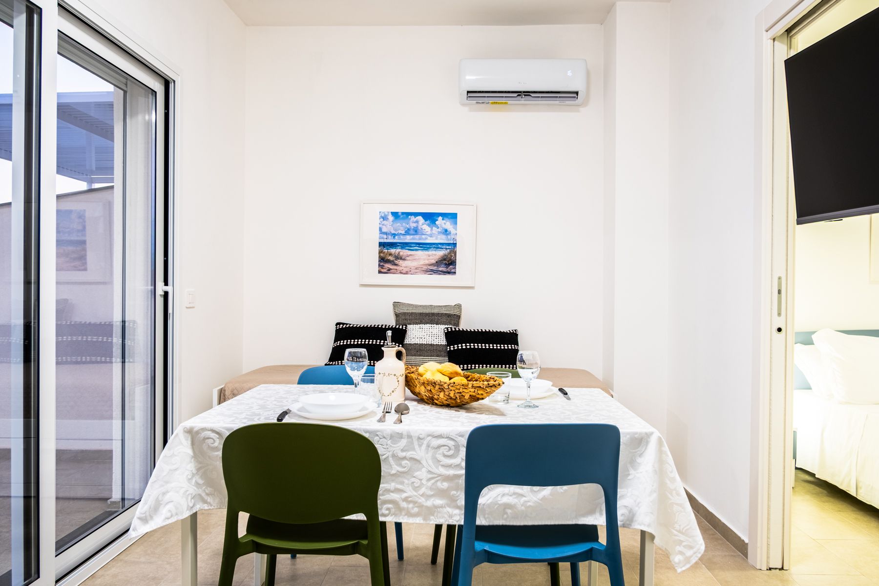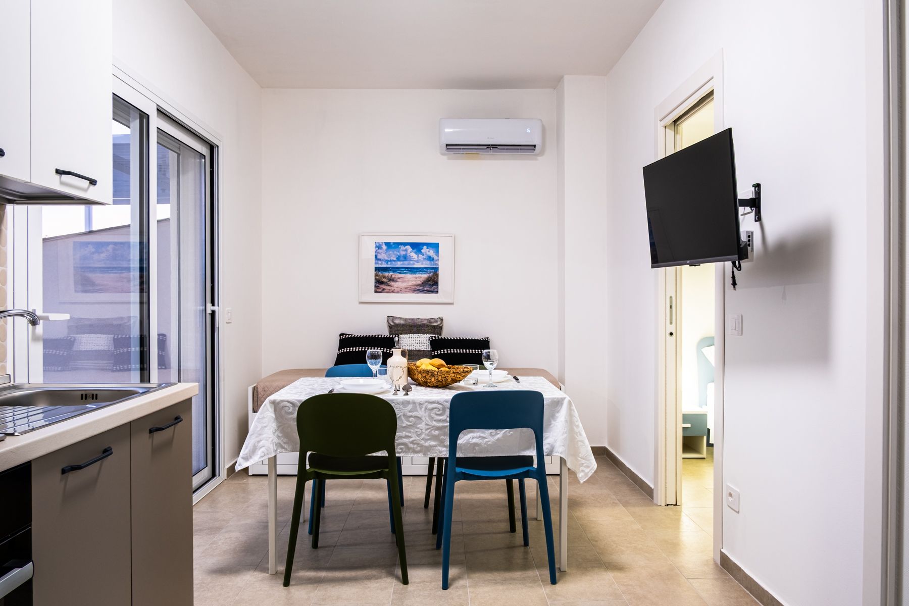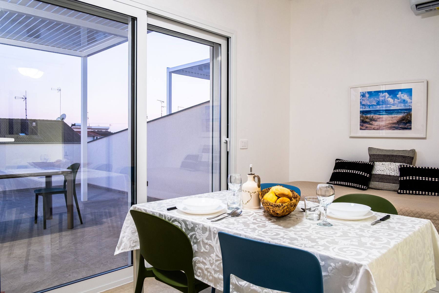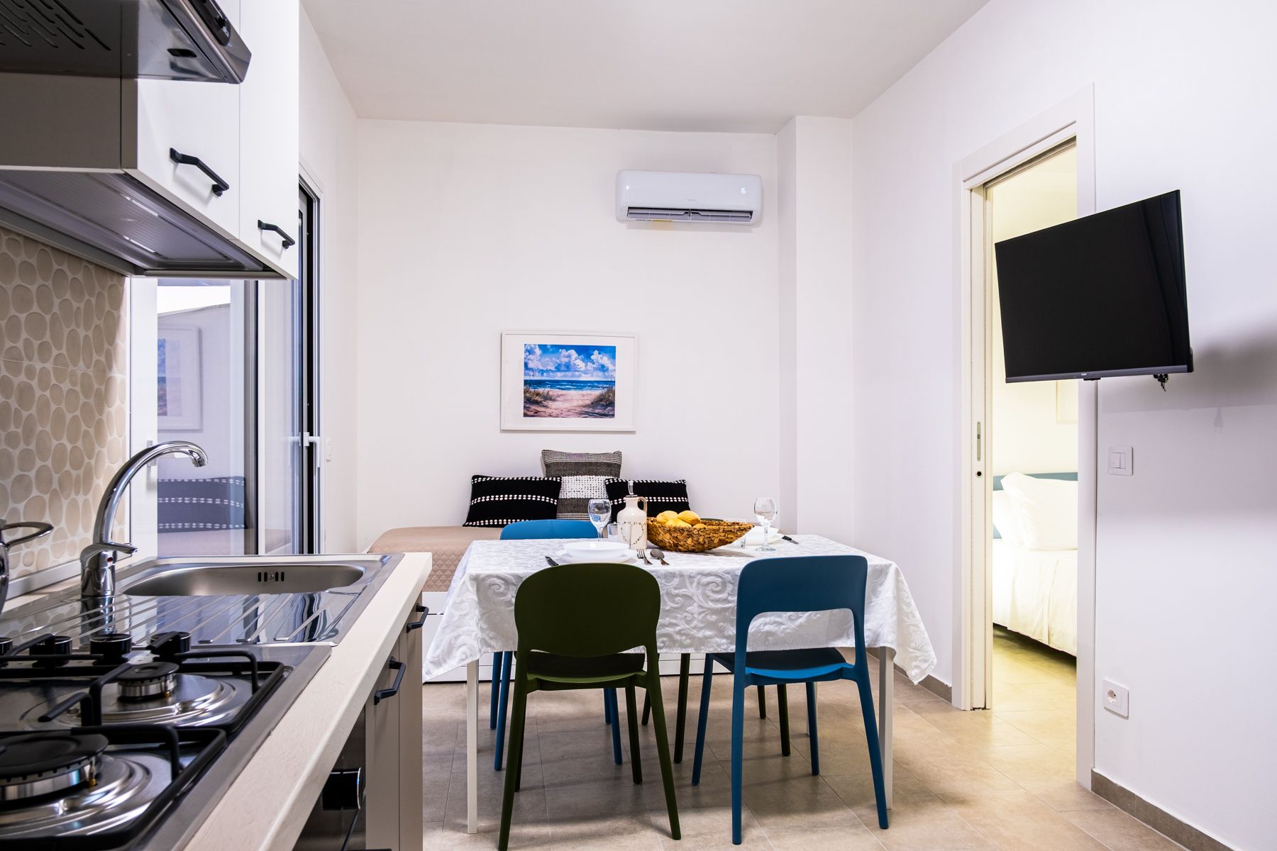 Situati al primo piano, questi bilocali sono perfetti per coppie o famiglie fino a 4 persone che vogliono trascorrere una vacanza rilassante. L’appartamento offre una camera matrimoniale, un bagno moderno e una cucina-soggiorno con divano letto matrimoniale, ideale per vivere momenti di convivialità e comodità. La terrazza attrezzata con tavolo e sedie invita a trascorrere ore piacevoli all’aperto, tra colazioni al sole o cene sotto le stelle. Ogni bilocale dispone di posto auto riservato, e la posizione del residence permette di raggiungere facilmente la spiaggia e le località vicine tramite la pista ciclo-pedonale lungo il mare.