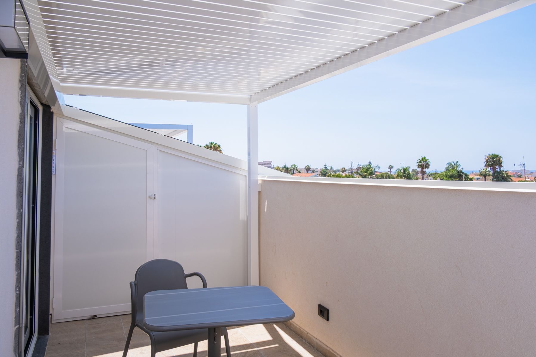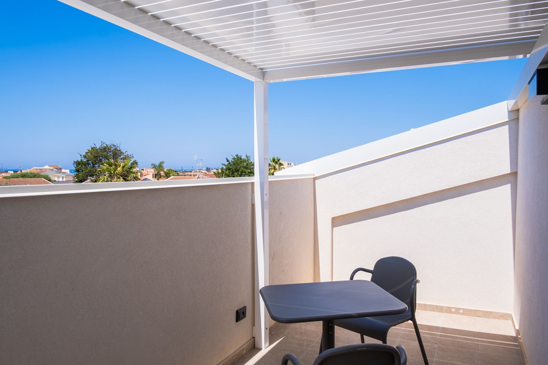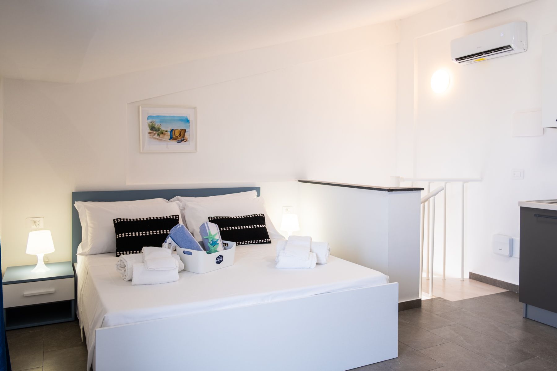 Al secondo piano, accessibile tramite scala a chiocciola, i monolocali sono ideali per coppie che desiderano una vacanza romantica o tranquilla. L’appartamento presenta un ambiente unico con letto matrimoniale, cucina e soggiorno, un bagno completo e un terrazzino con vista mare, perfetto per godersi la brezza marina e i tramonti. Ogni unità dispone di posto auto riservato e offre privacy e comfort in un contesto accogliente e rilassante. L’appartamento è climatizzato, con un’unità di aria condizionata posizionata nella
